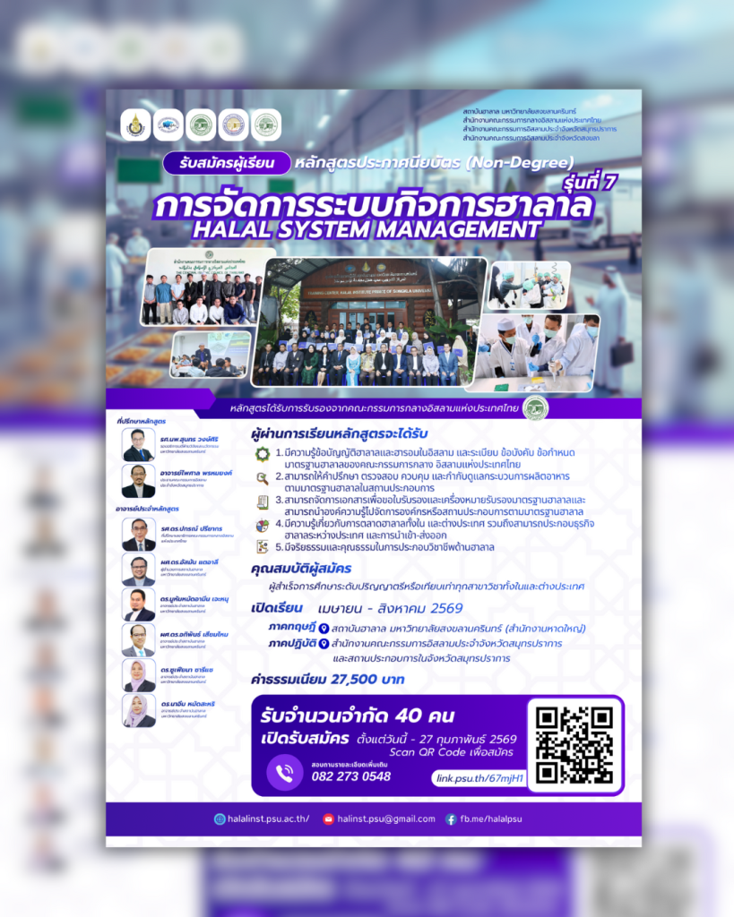 ✅ สิ่งที่จะได้รับจากการเรียน: ความรู้เชิงลึกด้านบัญญัติฮาลาลและระเบียบข้อบังคับต่างๆ ทักษะการตรวจประเมินและควบคุมกระบวนการผลิต การจัดการเอกสารเพื่อขอรับรองเครื่องหมายฮาลาล เจาะลึกการตลาดฮาลาลทั้งในและต่างประเทศ 📍 สถานที่เรียน: สถาบันฮาลาล มหาวิทยาลัยสงขลานครินทร์ วิทยาเขตหาดใหญ่ และ ฝึกปฏิบัติจริงที่ จ.สมุทรปราการ 🗓 ระยะเวลาเรียน: เมษายน – สิงหาคม 2569 👥 รับจำนวนจำกัดเพียง 40 ท่านเท่านั้น! 👉 สมัครได้ตั้งแต่วันนี้ – 27 กุมภาพันธ์ 2569 คลิกสมัครเลย: https://link.psu.th/67mjH1 สอบถามเพิ่มเติมโทร: 082 273 0548 #HalalManagement #PSU #HalalInstitute #หลักสูตรฮาลาล #HalalSystemManagement