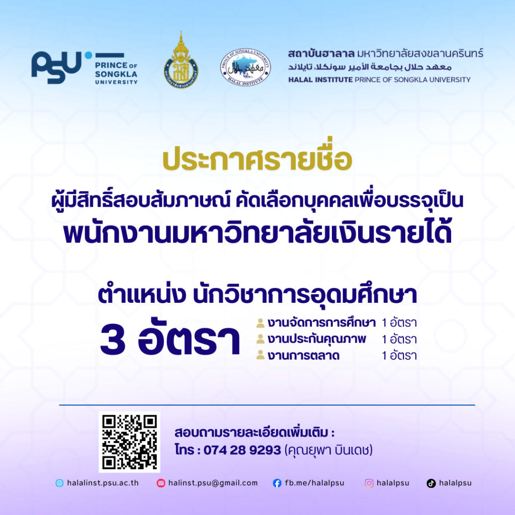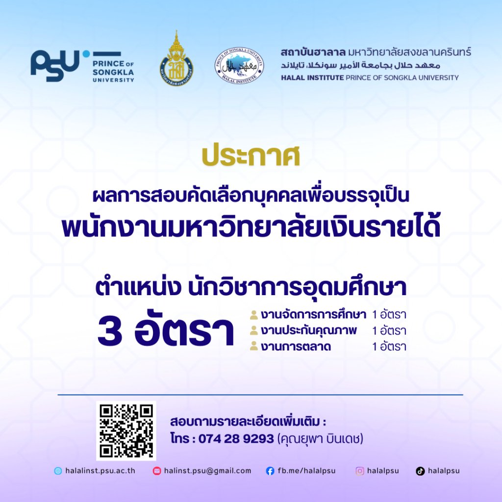 เปิดรับสมัครแล้ว! หลักสูตรประกาศนียบัตร (Non-Degree) “การบริหารจัดการโลจิสติกส์ฮาลาล” รุ่นที่ 3 โอกาสดีสำหรับผู้ที่อยากอัปสกิลสู่ธุรกิจยุคใหม่! สถาบันฮาลาล มหาวิทยาลัยสงขลานครินทร์ ร่วมกับ ITBS และ TIFFA เปิดประตูสู่เส้นทางอาชีพในอุตสาหกรรม Halal Logistics อย่างมืออาชีพ ✨ สิ่งที่จะได้รับจากหลักสูตรนี้: ความรู้เชิงลึกเกี่ยวกับโลจิสติกส์ฮาลาลและการประยุกต์ใช้จริง ฝึกปฏิบัติงานจริง ณ สถานประกอบการโลจิสติกส์ในประเทศไทย ประกาศนียบัตรรับรองจากสถาบันฮาลาล ม.สงขลานครินทร์ โอกาสร่วมงานในสถานประกอบการด้านโลจิสติกส์และธุรกิจฮาลาลชั้นนำ 📝 รายละเอียดหลักสูตร: คุณสมบัติ: วุฒิปริญญาตรีหรือเทียบเท่า (ทุกสาขาวิชา) ระยะเวลาเรียน: เมษายน – สิงหาคม 2569 สถานที่เรียน: ภาคทฤษฎี: สถาบันฮาลาล ม.สงขลานครินทร์ (หาดใหญ่) ภาคปฏิบัติ: บริษัทในเครือข่ายสมาคมผู้รับจัดการขนส่งสินค้าระหว่างประเทศ (กรุงเทพฯ และปริมณฑล) ค่าธรรมเนียม: 27,500 บาท 🔥 รับจำนวนจำกัดเพียง 40 คนเท่านั้น! 📅 สมัครได้ตั้งแต่วันนี้ – 27 กุมภาพันธ์ 2569 🔗 สมัครออนไลน์ได้ที่: link.psu.th/XNNtK 📞 สอบถามเพิ่มเติม: 082-273-0548 […]